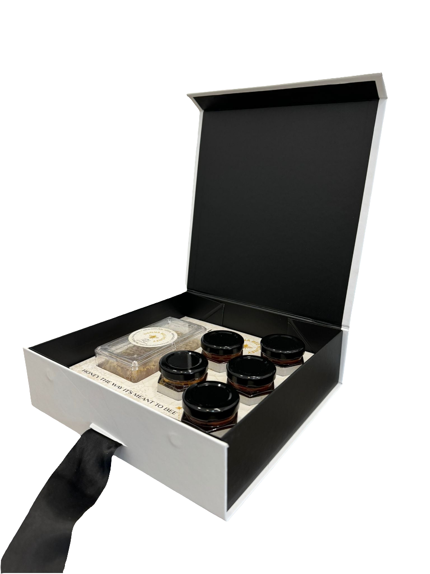 5, 2 oz Jars of our most famous honey and a Honey Comb